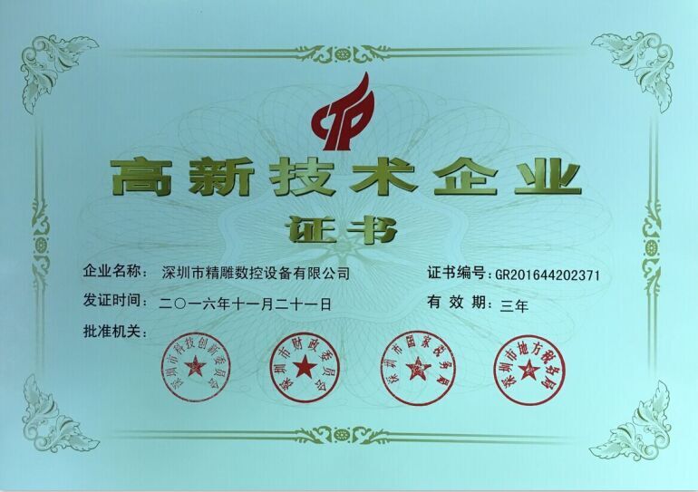 深圳市精雕數(shù)控設(shè)備有限公司2017年正式拿到國(guó)家國(guó)高企業(yè)認(rèn)定證書(shū)。